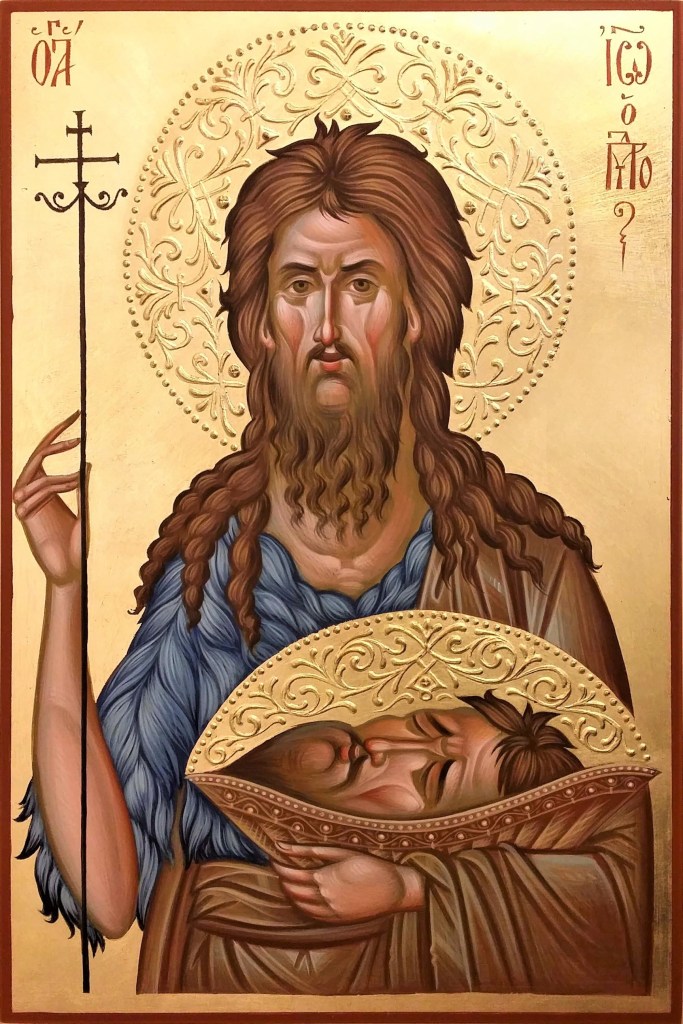 Byzantine-style Orthodox icon of St. John the Baptist, holding his own head. Date and artist unknown.
